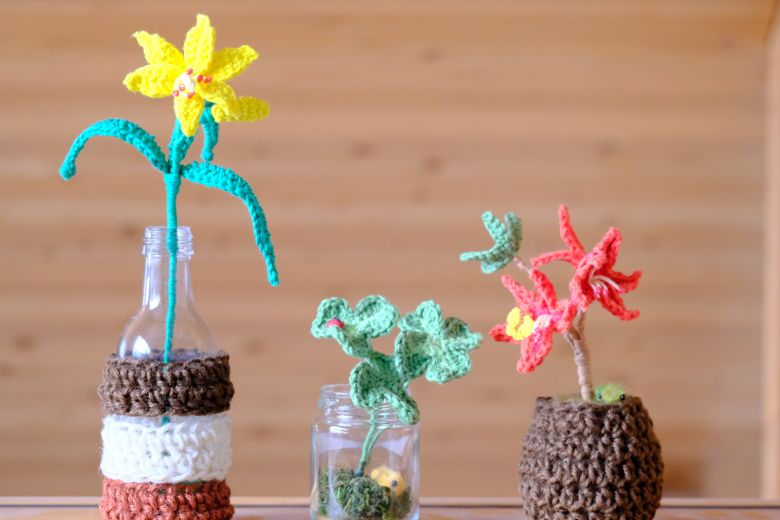 | 空き瓶アップサイクルオブジェ | | 空き瓶にニットを着せたさまざまなオブジェ | 丘のアトリエnido | インテリア雑貨 | アップサイクル | 長野 | |